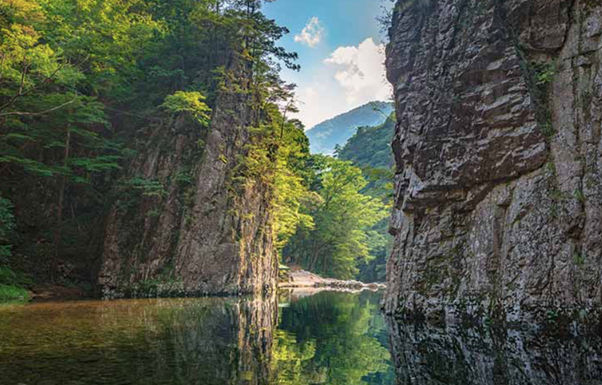 현 북서부 아키타마치에 있는 총 길이 약 16km의 대협곡 「산단쿄」. 깎아지른 절벽에 둘러싸인 「쿠로부치」와「엔비」, 초비경의 폭포 「이단폭포」, 「산단폭포」, 「미츠폭포」의 「5대 경관」은 꼭 보시길 추천 드립니다.