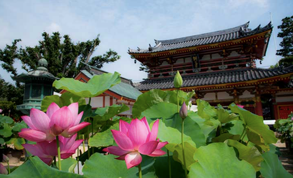 오사카의 전 기업가 고산사 고조가 어머니에게 감사하는 마음을 담아 건립한 이쿠구치 섬에 있는 정토진종 본원사파 사원 '고산사'.