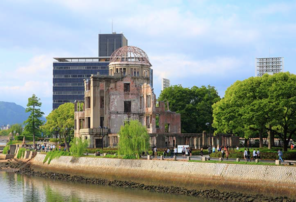 1945년 8월 6일 8시 15분에 히로시마에 떨어진, 인류 사상 최초의 원자 폭탄의 참상을 전하는 「원폭 돔」. 오타 강의 지류·모토야스 강변에, 거의 피폭된 당시의 모습으로 서, 전쟁과 핵병기의 비참함을 현대에 전하고 있습니다. 1996년에는 세계문화유산으로 등재되었습니다.