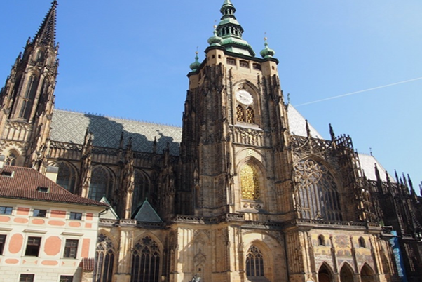 ① 정문으로 들어서면 먼저 눈에 들어오는 것이, 당당히 솟은 「성비트 대성당」.