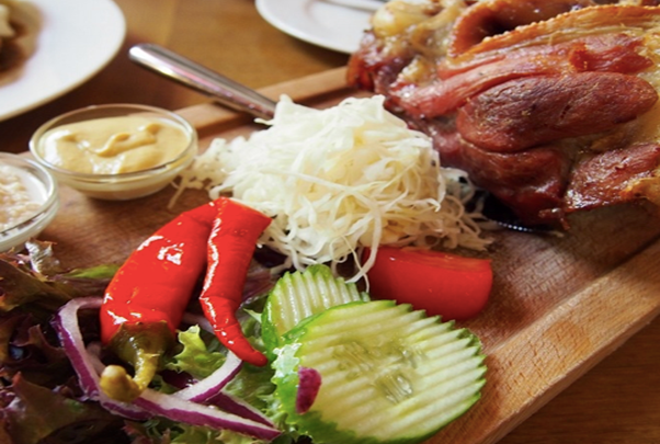 포크너클은 고기에 칼을 꽂아서 나오기 때문에 박력 만점! 콜라겐이 듬뿍 들어 있는 겨자와 서양 고추냉이를 찍어 먹습니다. 고기 요리에 곁들여 나오는 찐빵 같은 크네드리키도 꼭 드셔 보십시오.